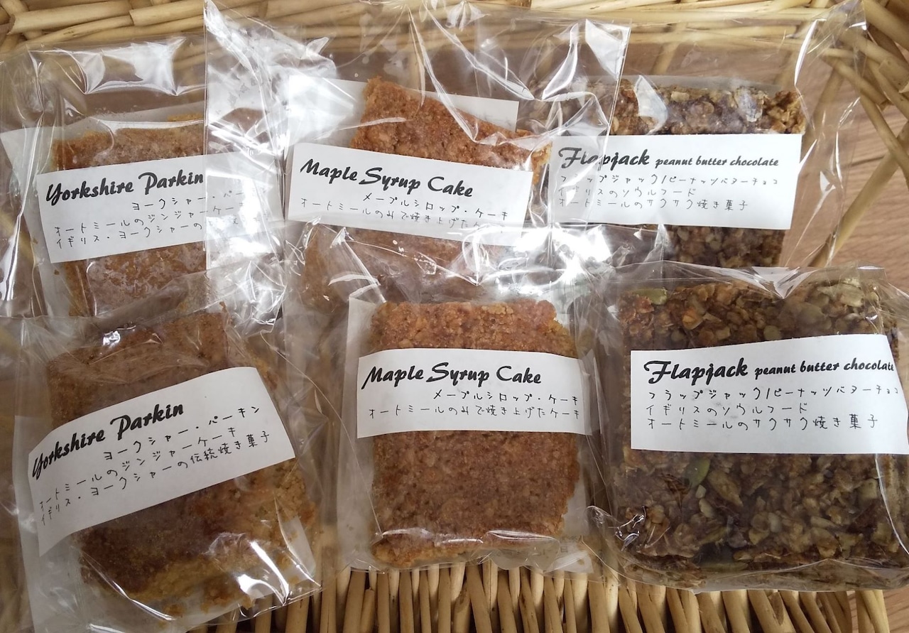 原材料:オートミール、バター、ゴールデンシロップ(糖蜜)、黒みつ、てんさい糖、卵、豆乳